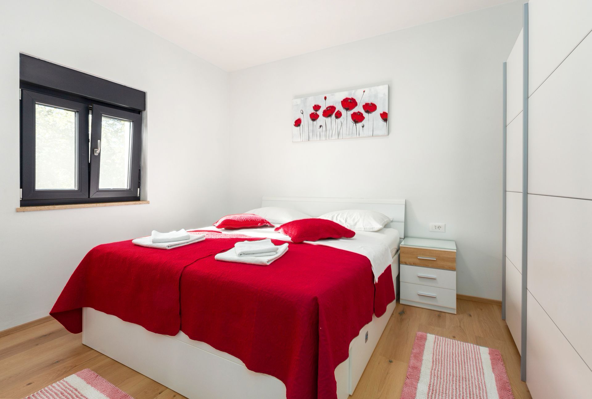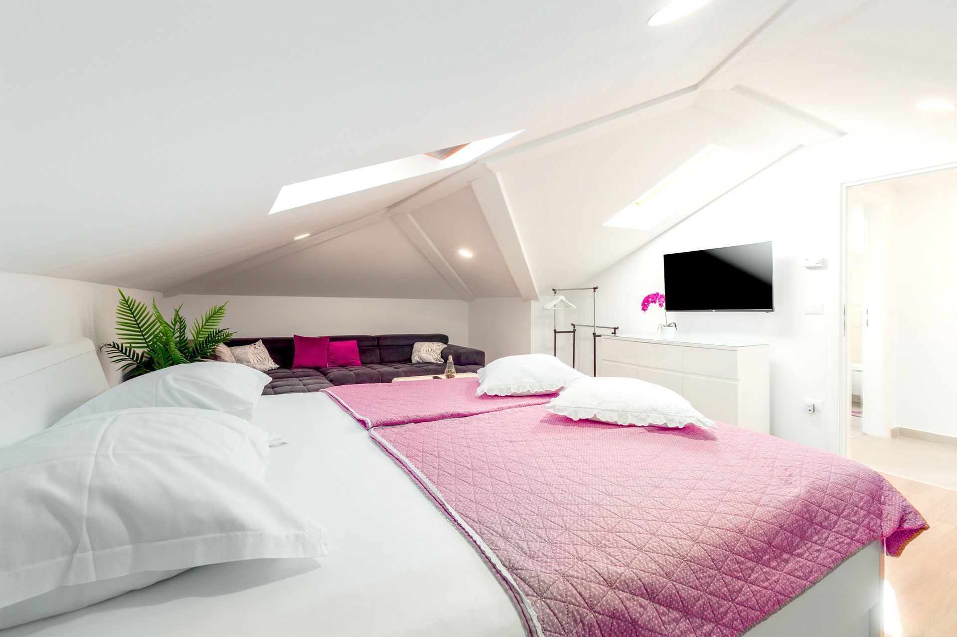U potkrovlju je prostrana spavaća soba s bračnim krevetom i dodatnom sofom na razvlačenje. Uz sobu se nalazi velika kupaonica i toalet. U prizemlju se nalaze još dvije sobe s bračnim krevetom, koje dijele veliku kupaonicu i zaseban toalet. Prema potrebi, sofa u dnevnom boravku je na razvlačenje i može poslužiti kao dodatni krevet za dvije osobe ili djecu.