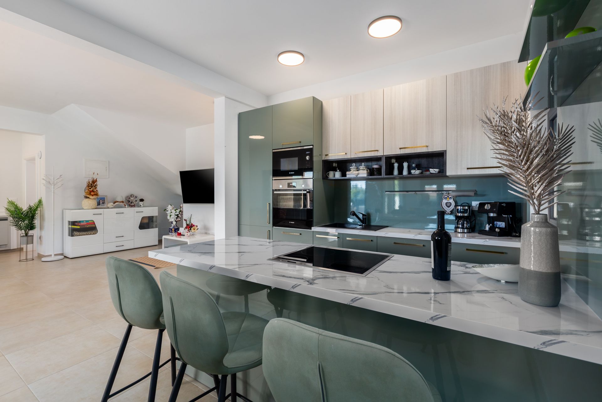 Eine moderne und voll ausgestattete Küche mit Esszimmer und damit ein sehr komfortables Wohnzimmer, tragen zu einer angenehmen Atmosphäre und Ihrer vollkommenen Entspannung bei.